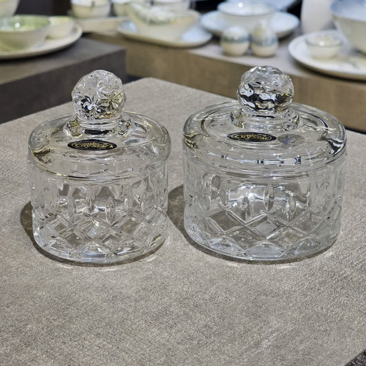 قندان و جا نقلی ساخت کشور چین بسیار شفاف ابعاد جا نقلی:ارتفاع(۱۰ سانتی متر) و قطر(۷.۳ سامتی متر ابعاد قندان:ارتفاع(۱۰.۲ سانتی متر) و قطر(۸.۷ سانتی متر)